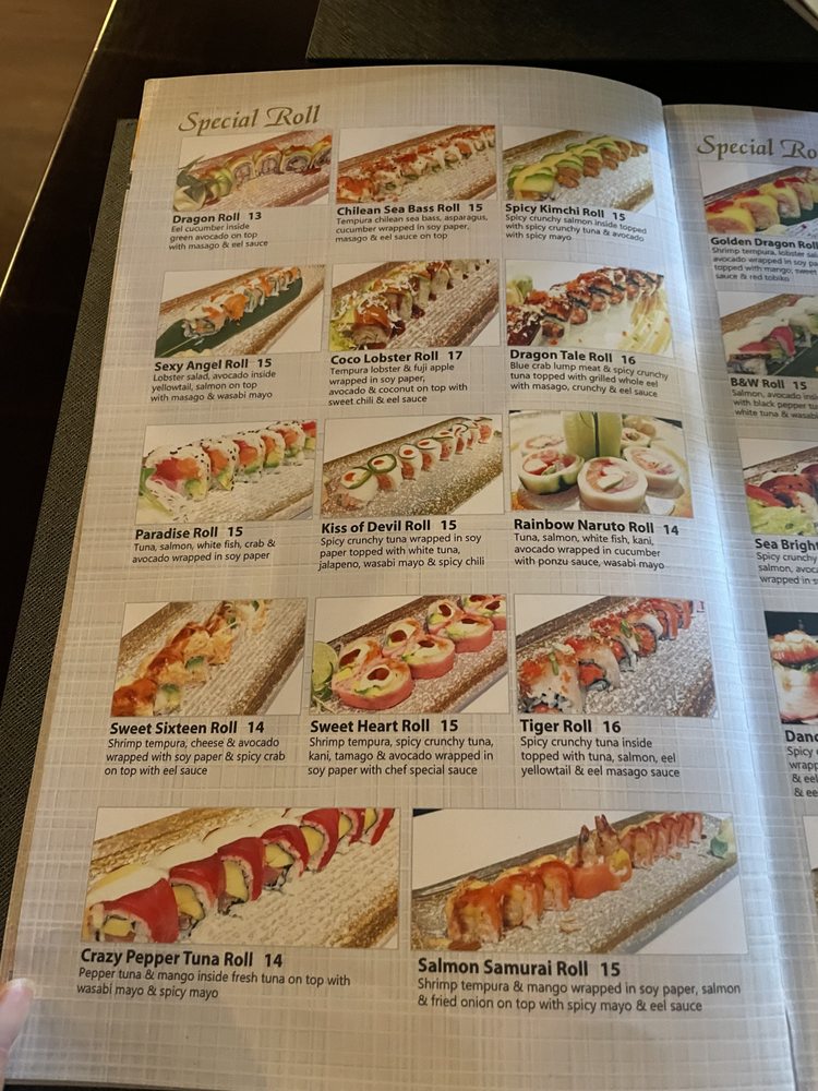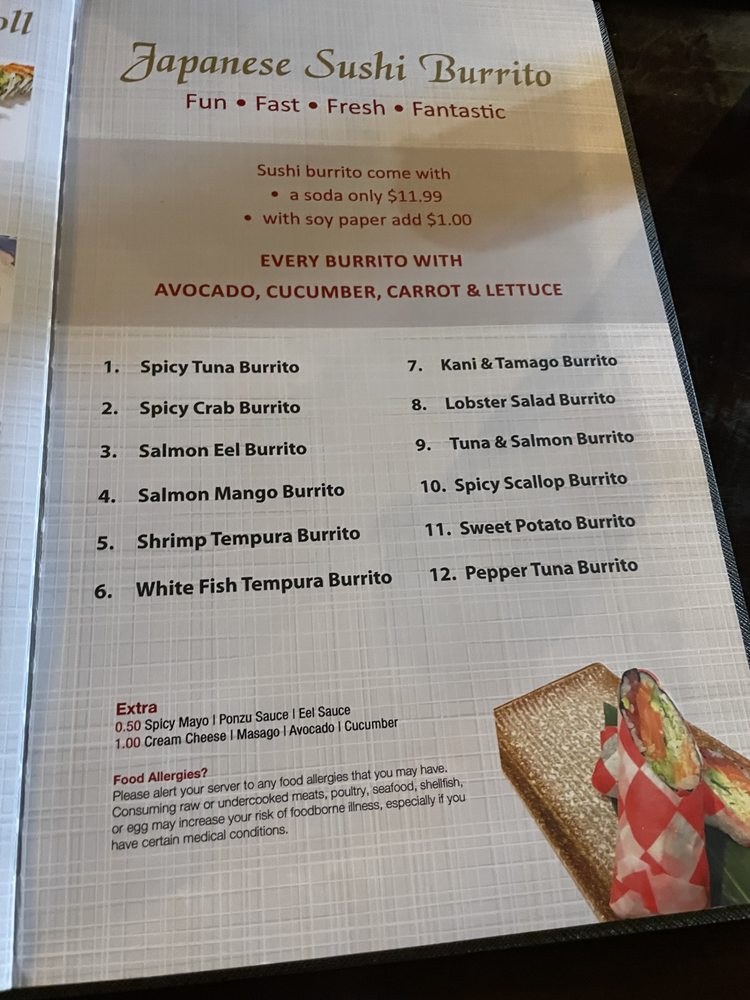 Tuna, salmon, eel, avocado, cream cheese wrapped, seaweed paper deep fried, special sauce.